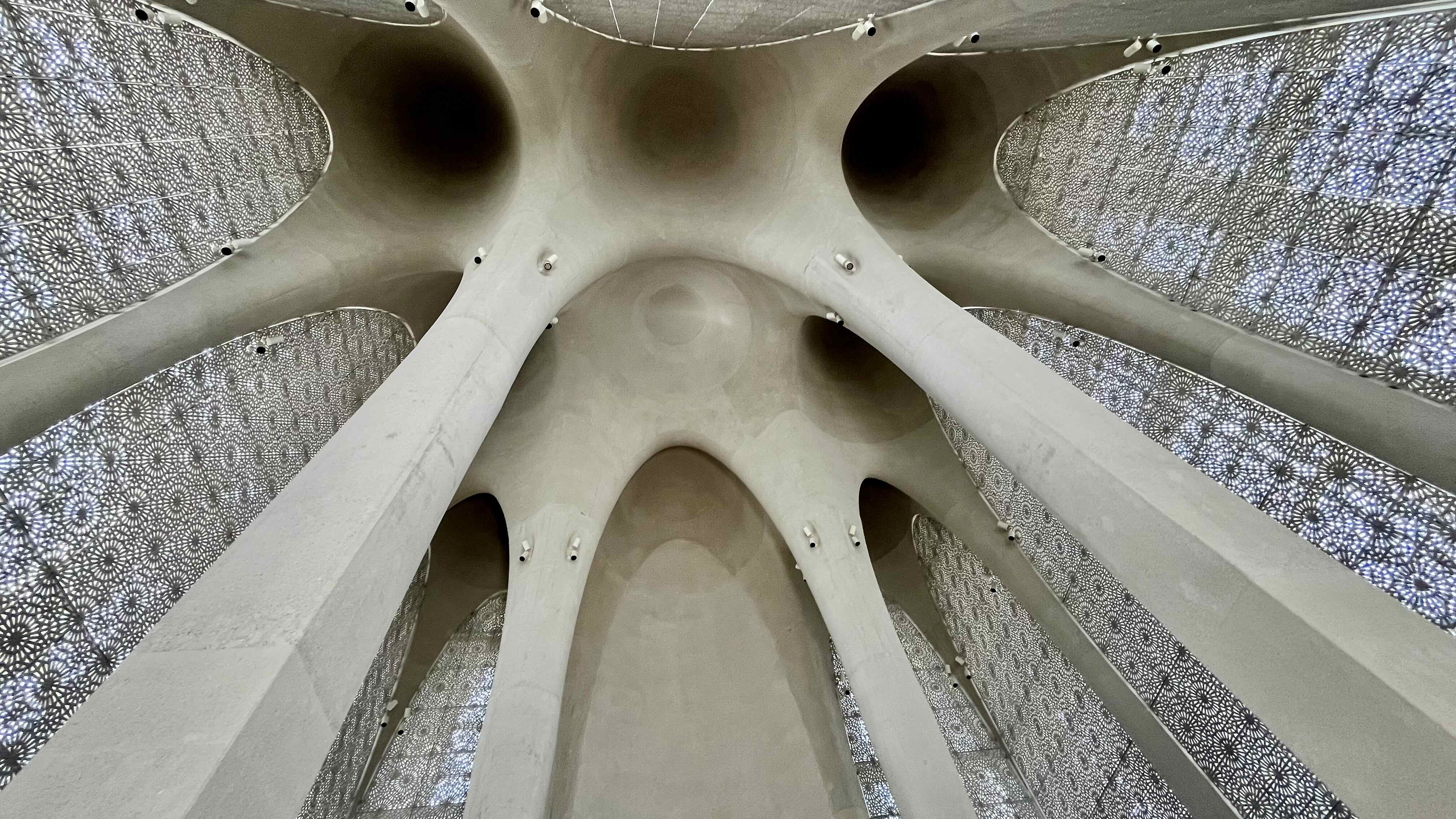 At the heart of the interior lies an open prayer hall, bathed in diffused light. The dome, supported by slender columns, appears to float above the space, enhancing the feeling of openness and serenity. The ceiling is inspired by the Cave of Hira, where, according to Islamic tradition, the Prophet Muhammad received his first revelation. The architects sought to evoke the atmosphere of solitude and profound spiritual experience associated with that place — the ceiling envelops visitors in a gentle shadow, encouraging reflection and inner silence.