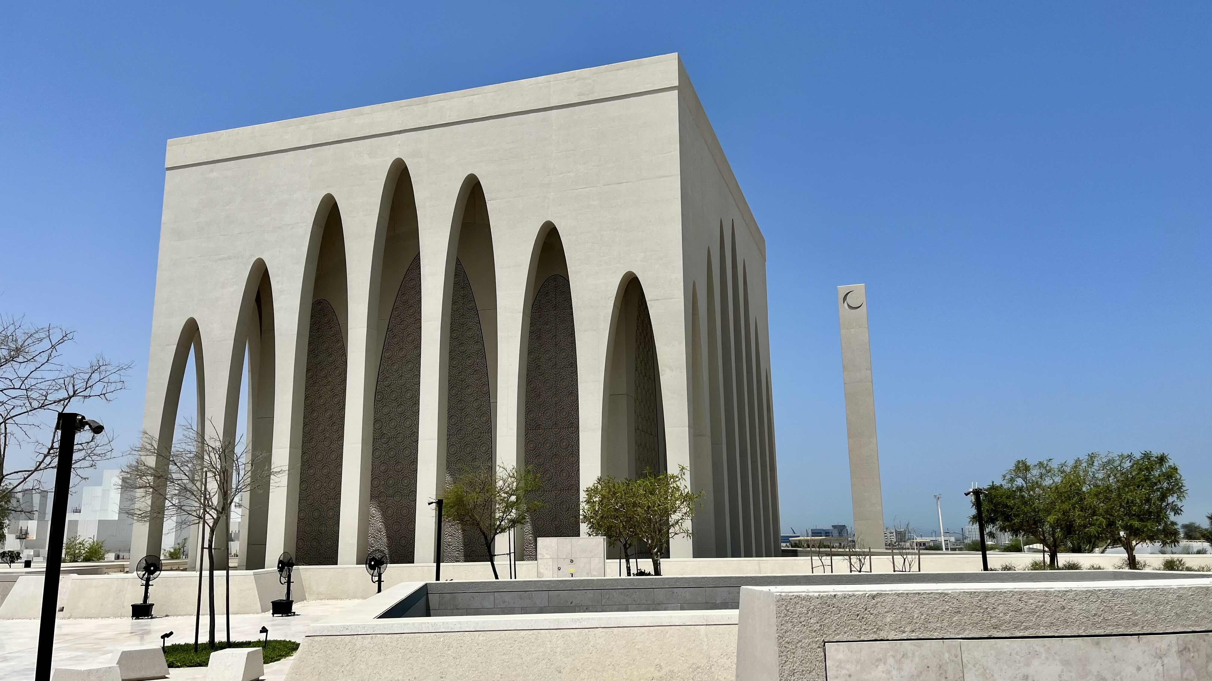 Quiet and restrained, the mosque seems to absorb the light that filters through its delicately patterned walls. Its architecture draws on traditional Islamic principles, where rhythm, symmetry, and calm become a language of spirituality. The façades are cut by seven elongated arches — a reference to the seven heavens, the seven days of creation, and the seven circuits of the Hajj.