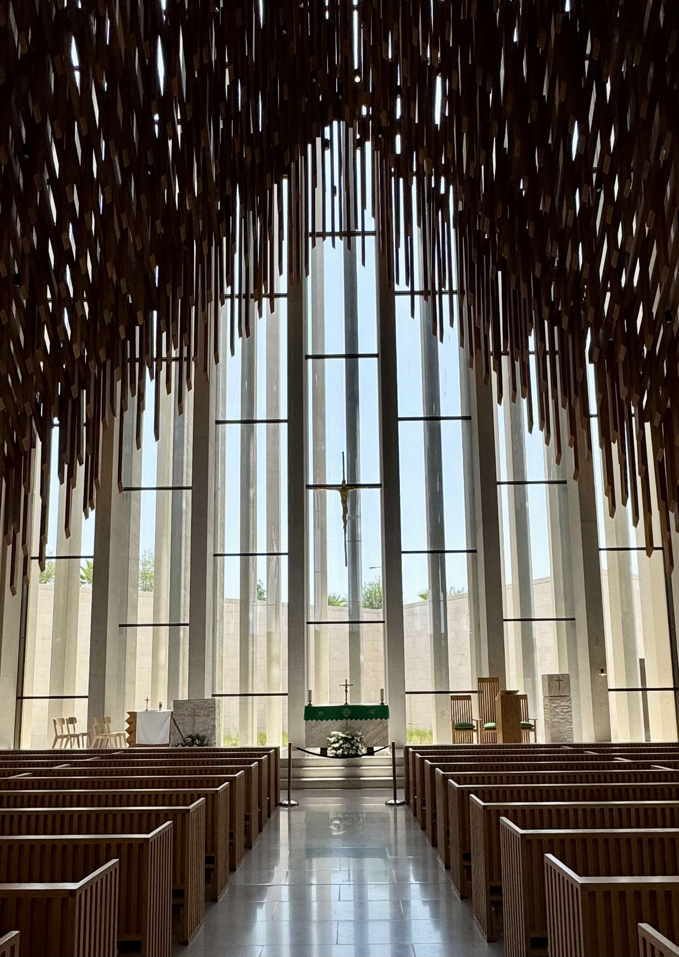 Above, a remarkable wooden ceiling composed of hundreds of slender slats forms a dynamic, almost floating structure. It shapes the acoustics of the space and evokes the image of light rising from within — a metaphor for hope and blessing descending gently upon those below.