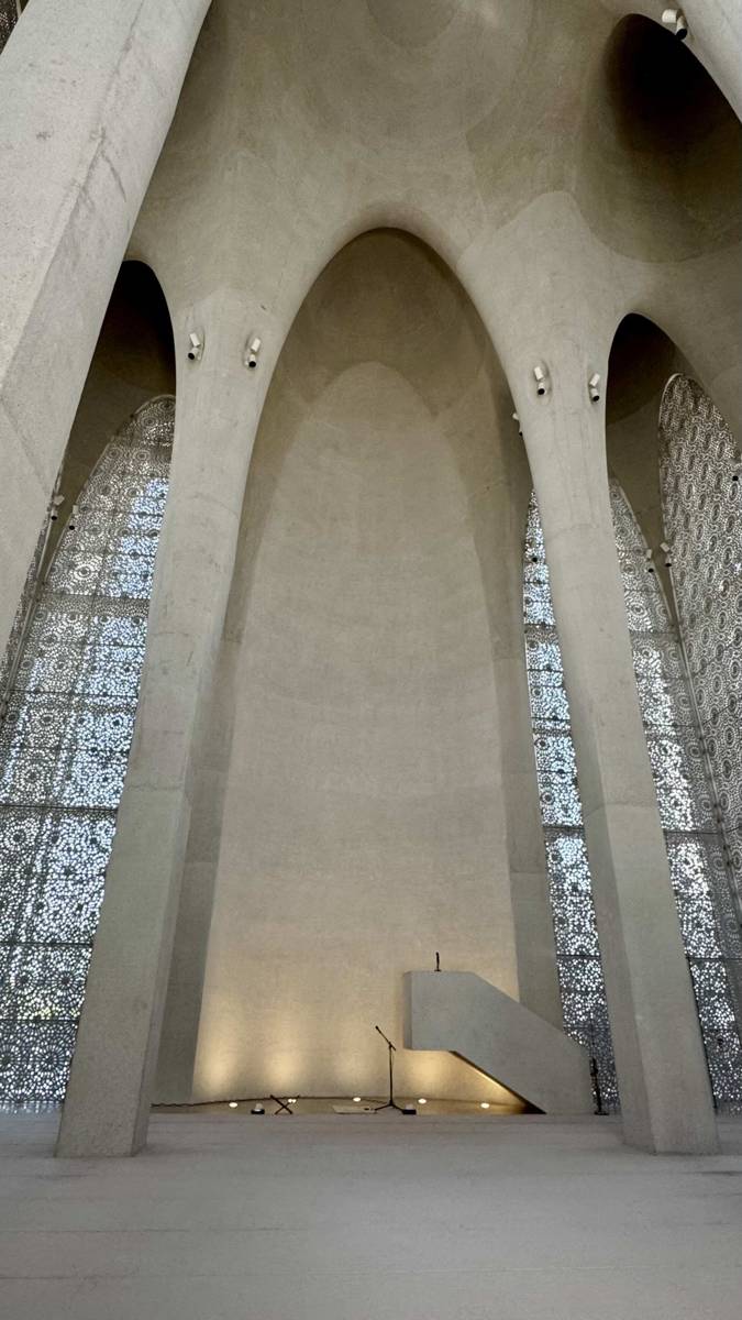 As with the other two sanctuaries, water welcomes visitors at the entrance. The mosque’s inner courtyard includes separate male and female ablution areas, concealed behind bronze gates that echo the rhythm of the façade arches. Water — a symbol of purification, life, and sanctity — becomes a shared element across all three religions, quietly emphasizing their common roots.