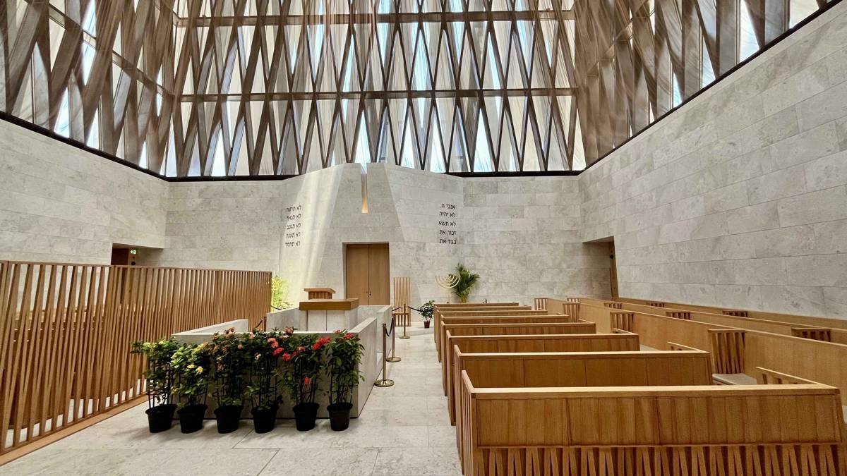 The interior palette is calm and natural: wood, limestone, soft plaster. It is a background that quietly insists: “Here, the word comes first.” Special attention is drawn to the bimah, the raised platform from which the Torah is read, distinguished by refined wooden detailing that bridges tradition with contemporary restraint.