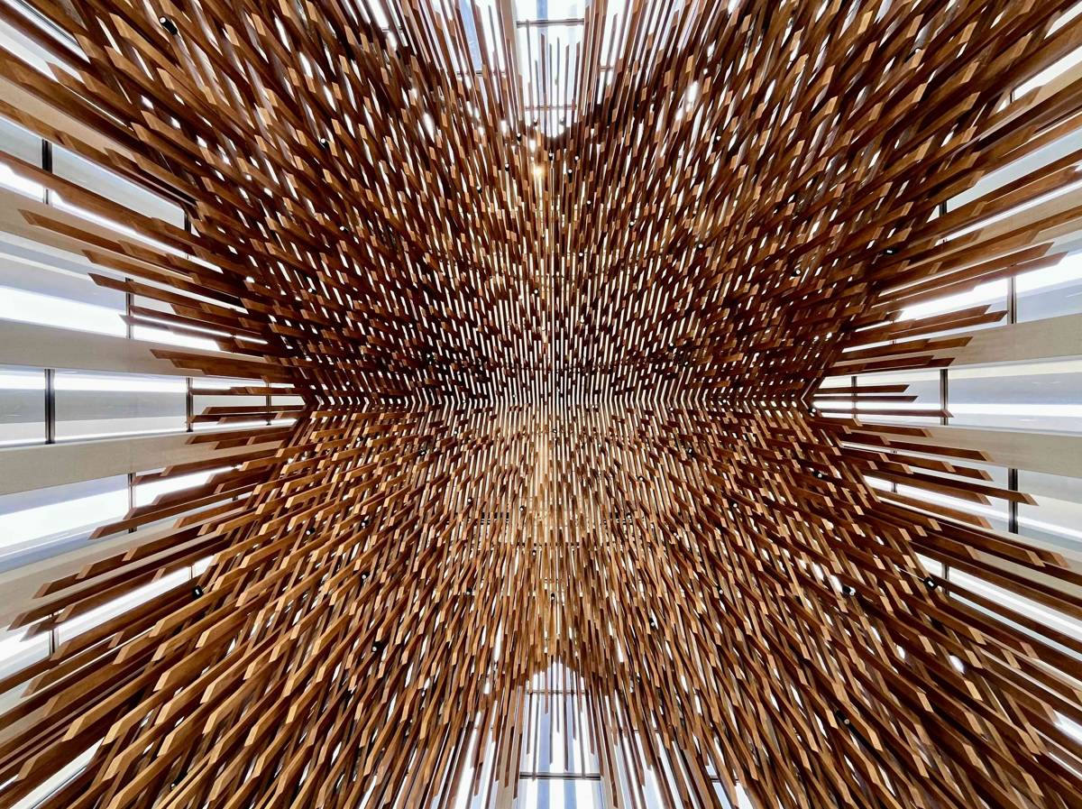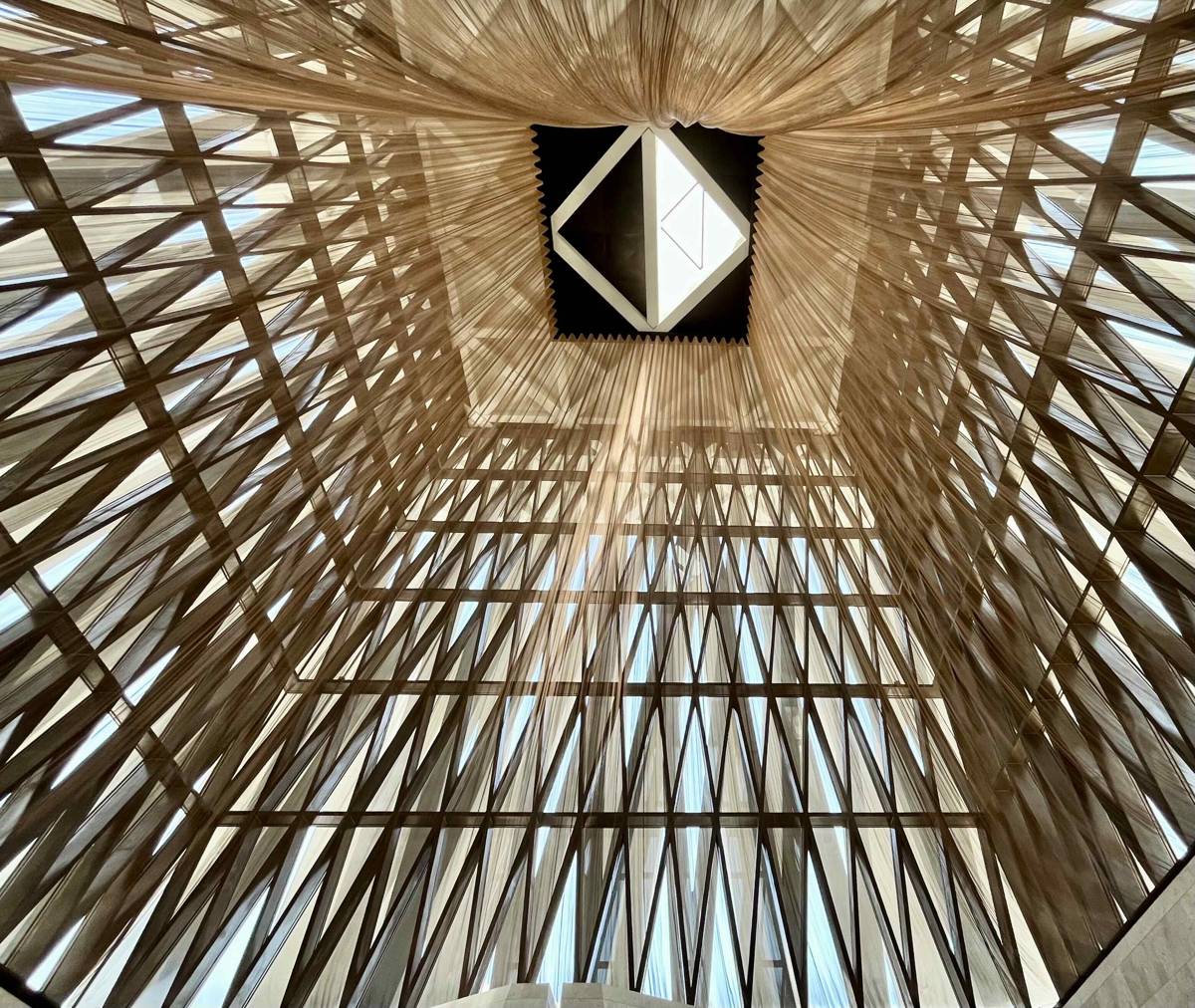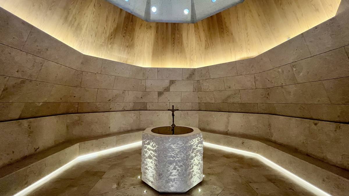 Above, a remarkable wooden ceiling composed of hundreds of slender slats forms a dynamic, almost floating structure. It shapes the acoustics of the space and evokes the image of light rising from within — a metaphor for hope and blessing descending gently upon those below.