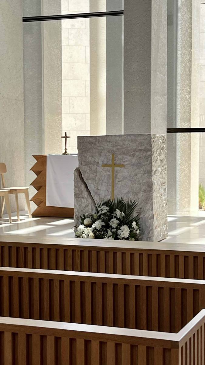 The interior follows principles of minimalism and natural honesty. The altar is carved from raw stone, seemingly drawn directly from the earth, with a delicate inlay of a cross. This powerful monolith symbolizes the firmness of faith and quiet strength of spirit, while fresh flowers at its base introduce warmth and life.